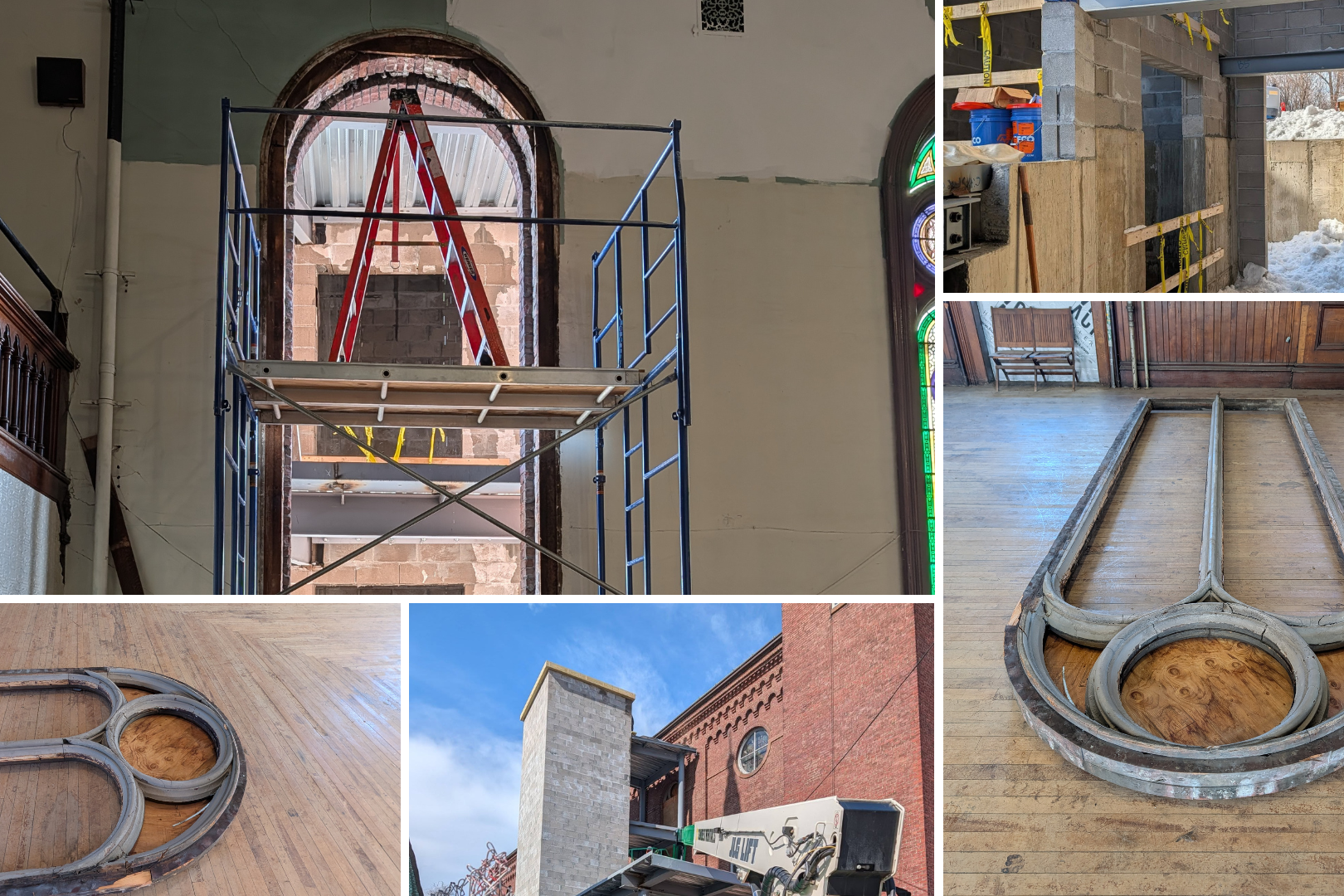 Construction at Old Town Hall is advancing behind scaffolding, with careful restoration work underway to make the building fully accessible while restoring and re-presenting its historic stained glass.